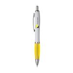 Blue or blackink ballpoint pen with white barrel with coloured, non-slip grip and metal clip.